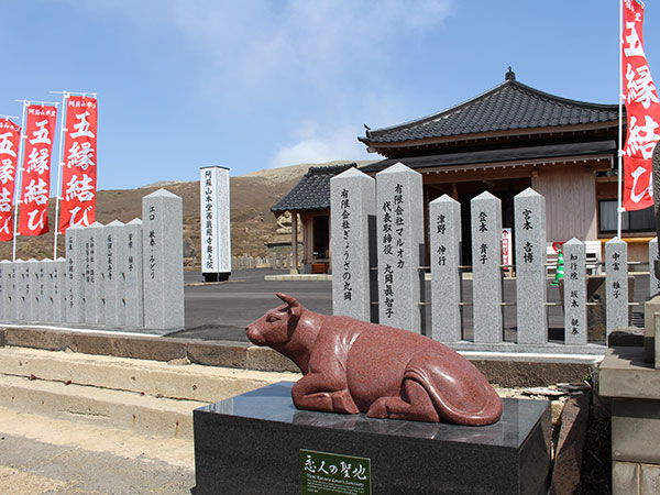 草原でゆっくりと草を食むあか牛の姿は、阿蘇を代表する風景です。 阿蘇にある「恋人の聖地」のシンボルとして「縁結びのあか牛」モニュメントを設置しました。 参拝を終え、思いを込めて撫でたら願いが叶ったという方も多数お礼参りに来られています。