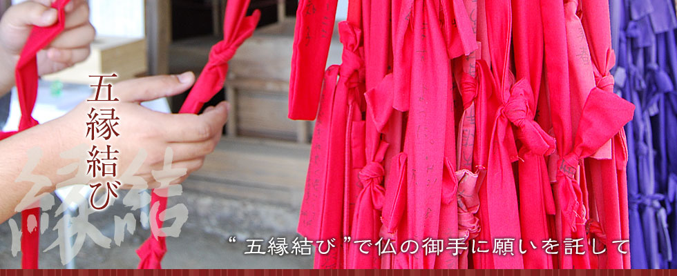 「五縁結び」の五色の紐は、本堂内の十一面観音様の御手につながっており、これに触れることで仏様と御手(おて)つぎをすることができます。